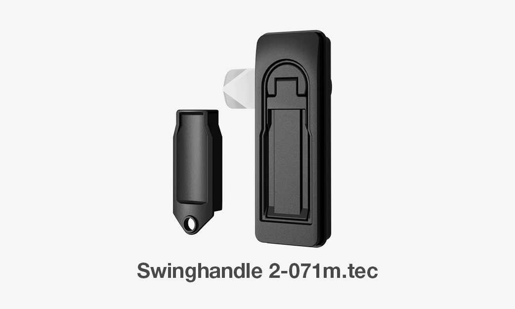 The Swinghandle 2-071 m.tec impresses with its vibration resistance and flat design. It is protected against dust and water to IP65 in accordance with DIN EN 60529 and offers a reliable latching solution that is ideal for use in various applications.